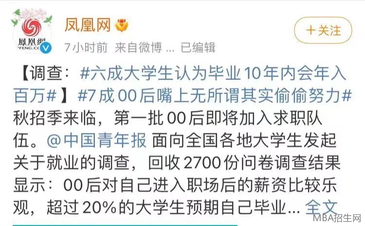 今日,一則新聞登上微博熱搜,六成大學(xué)生認(rèn)為畢業(yè)10年內(nèi)會(huì)年入百萬,其調(diào)查結(jié)果顯示,00后對(duì)自己進(jìn)入職場后的薪資比較樂觀,超過20%的大學(xué)生預(yù)期自己畢業(yè)后月薪過萬,其中8.20%男生和3.25%女生預(yù)期自己會(huì)進(jìn)“5萬元俱樂部”。此外,67.65%大學(xué)生評(píng)估自己畢業(yè)10年內(nèi)會(huì)年入百萬。