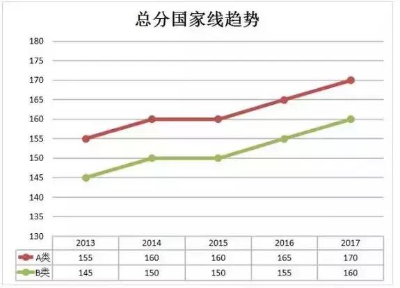 從2013年開始MBA聯考的國家線一路高歌猛進,從155分一路飆升至170分,這一路高升的分數讓很多考生不免擔心,今年的管理類聯考的分數線會不會又要再次升溫?畢竟今年的報考人數相對于去年來說報考人數又大幅增加,專業學位報考人數也開始逐漸增多。我們先看一下近五年國家線的趨勢,如下圖所示: