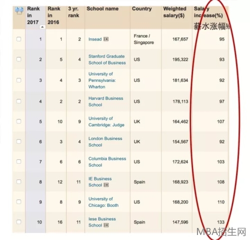 其中大家最關(guān)注的還是畢業(yè)起薪以及薪水漲幅這兩項(xiàng)指標(biāo),這也是每年申請(qǐng)MBA的候選人最關(guān)注的指標(biāo)。2017年FT發(fā)布的2017全球MBA排名如下: